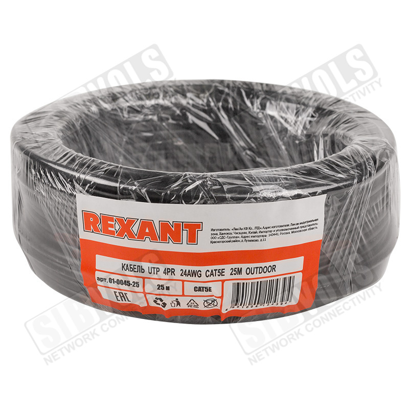 Кабель витая пара U/UTP, CAT 5e, PE, 4PR, 24AWG, OUTDOOR, SOLID, черный, 25м, REXANT