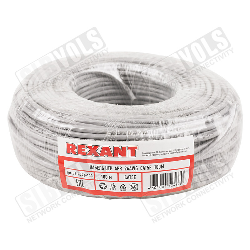 Кабель витая пара U/UTP, CAT 5e, PVC, 4PR, 24AWG, INDOOR, SOLID, серый, 100м, REXANT