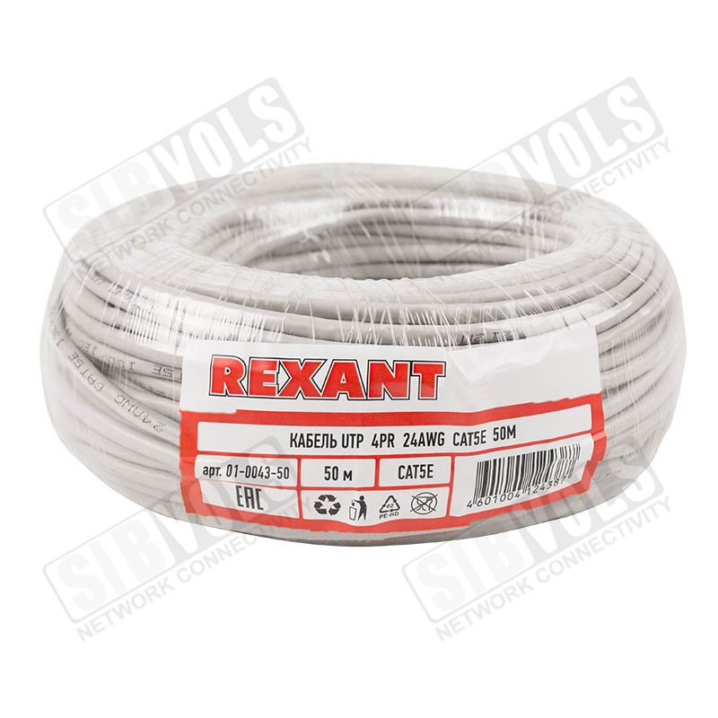 Кабель витая пара U/UTP, CAT 5e, PVC, 4PR, 24AWG, INDOOR, SOLID, серый, 50м, REXANT