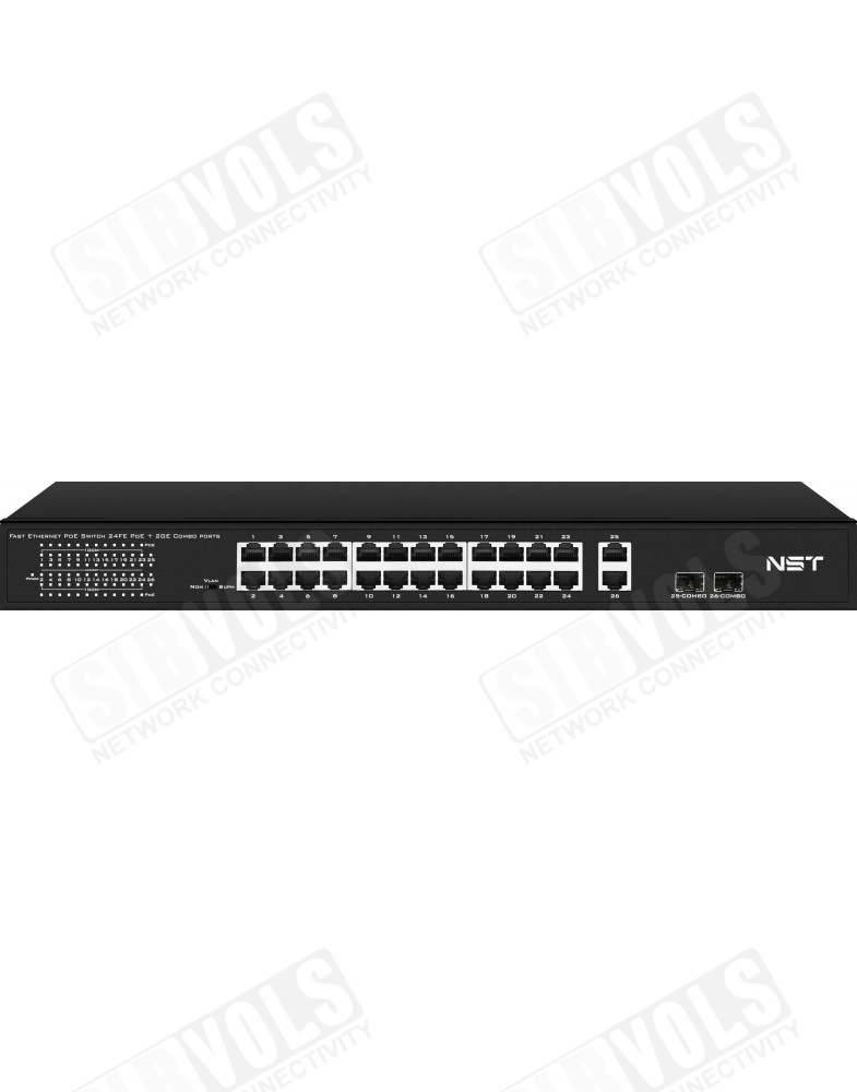 PoE коммутатор Fast Ethernet на 24 x RJ45 портов + 2 x GE Combo uplink порта. Порты: 24 x FE (10/100 Base-T) с поддержкой PoE (IEEE 802.3af/at), 2 x GE Combo Uplink (RJ45 + SFP). Соответствует стандартам PoE IEEE 802.3af/at. Автоматическое определение PoE устройств. Мощность PoE на порт - до 30W. Суммарная мощность PoE до 385W. Поддержка режима CCTV: Увеличение расстояния передачи данных и питания до 250м, изоляция портов (VLAN). Встроенная грозозащита 3kV на порт. Питание: AC100-240V (400W). Встроенный БП. Монтаж в 19 - дюймовую стойку, крепление в комплекте. Размеры (ШxВxГ) 440 x 45 x 290мм. Рабочая температура: -10...+55 гр. С.