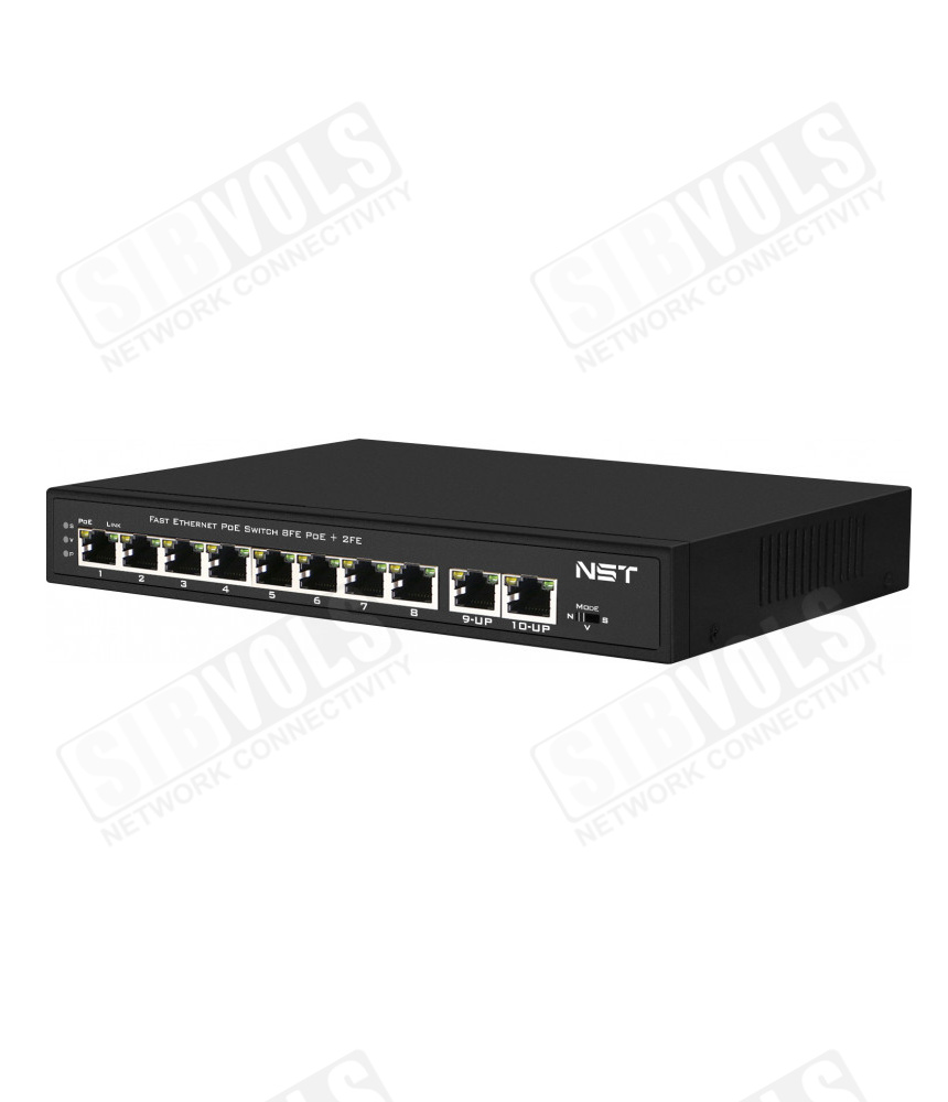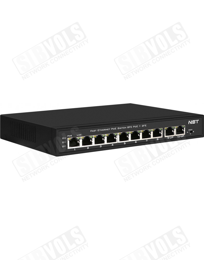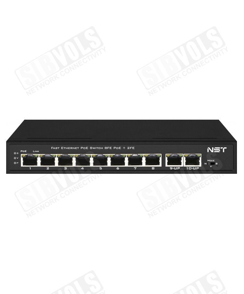 PoE коммутатор Fast Ethernet на 10 RJ45 портов. Порты: 8 x FE (10/100 Base-T) с поддержкой PoE (IEEE 802.3af/at), 2 x FE (10/100 Base-T). Соответствует стандартам PoE IEEE 802.3af/at. Автоматическое определение и режим антизависания PoE устройств. Мощность PoE на порт - до 30W. Суммарная мощность PoE - до 120W. Поддержка режима CCTV: Увеличение расстояния передачи данных и питания до 250м, изоляция портов (VLAN). Встроенная грозозащита 6кВ. Питание: AC100-240V (123W). Размеры (ШxВxГ): 210x35x150мм. Рабочая температура: -10...+55 гр. С.