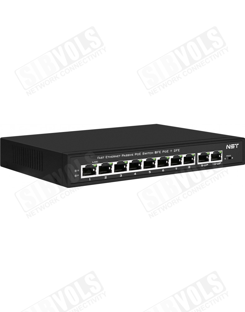 Passive PoE коммутатор Fast Ethernet на 10 портов. Порты: 8 х FE (10/100 Base-T, 52V 4,5(+) 7,8(–)) совместимы с PoE (IEEE 802.3af/at), 2 x FE (10/100 Base-T) Uplink. Совместим со стандартами PoE IEEE 802.3af/at. Мощность PoE на порт - до 30W. Поддержка режима CCTV: Увеличение расстояния передачи данных и питания до 250м. Встроенная грозозащита 3кВ. Питание: AC100-240V. Встроенный БП. Размеры (ШхВхГ): 210x35x150мм. Рабочая температура: 0...+50 гр. С