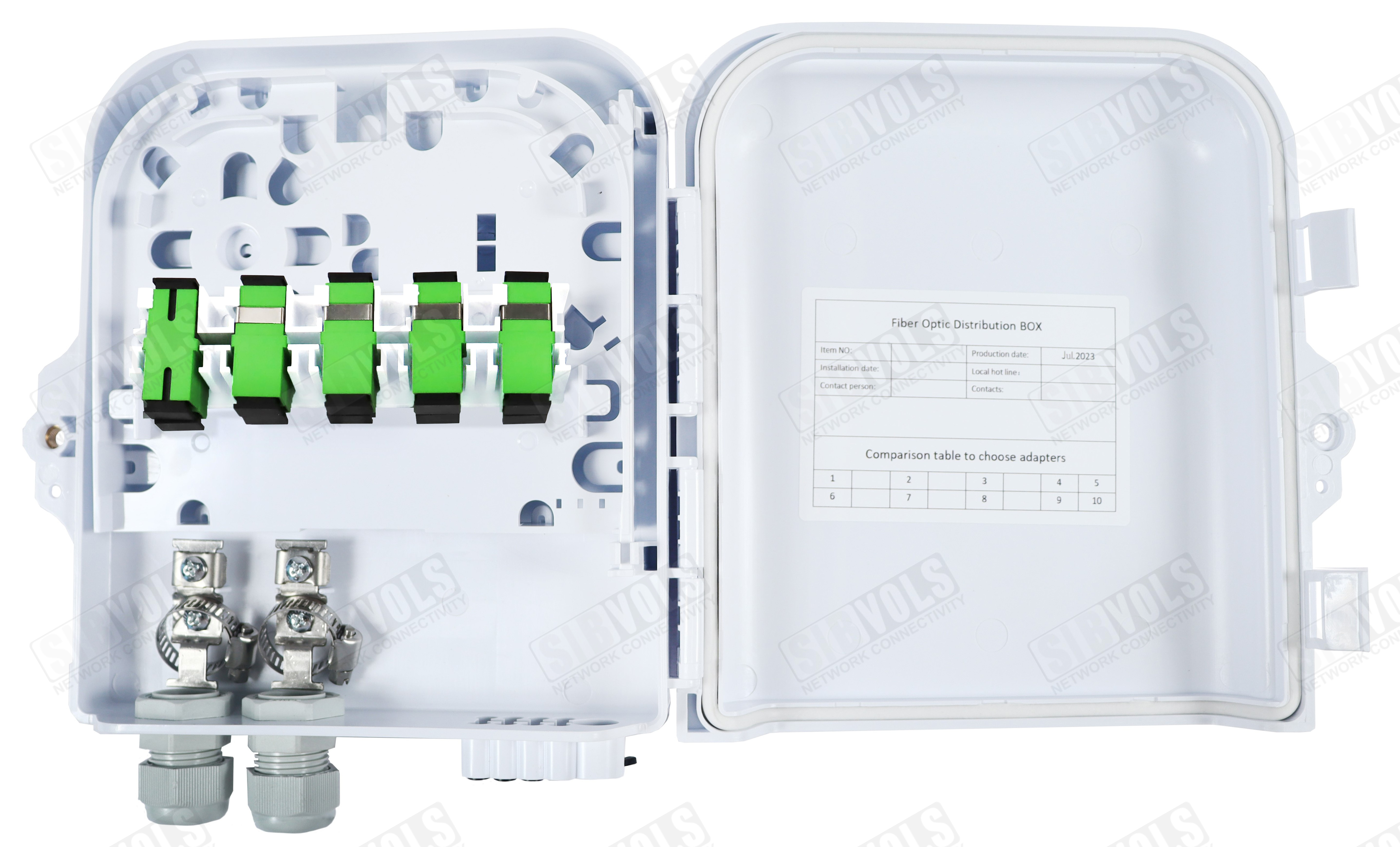 Внутри муфты расположена кассета с возможностью распределения до 12 SC адаптеров, а также можно установить PLC сплиттера как кассетного типа, так и с микрокорпусом до 12 SC адаптеров.