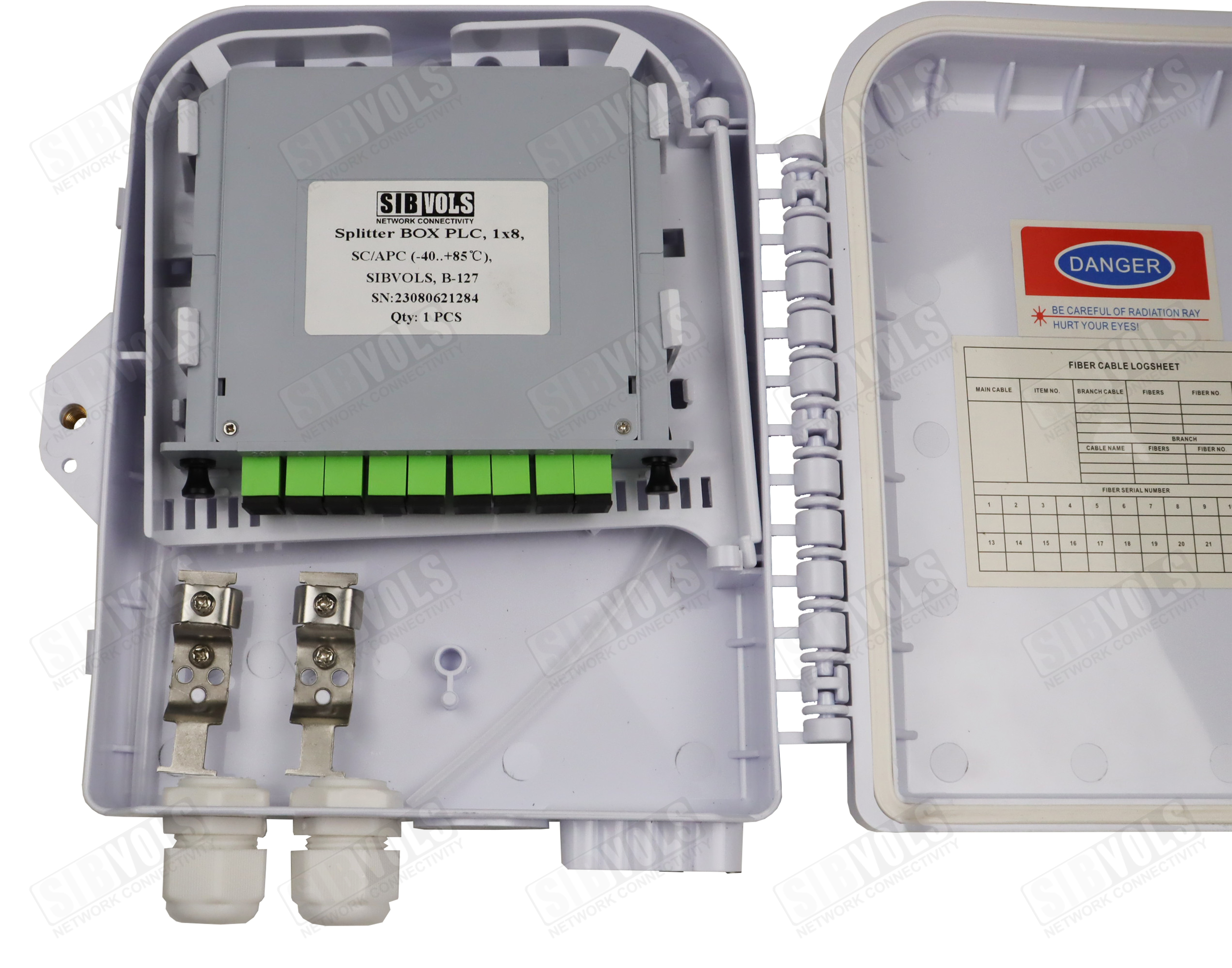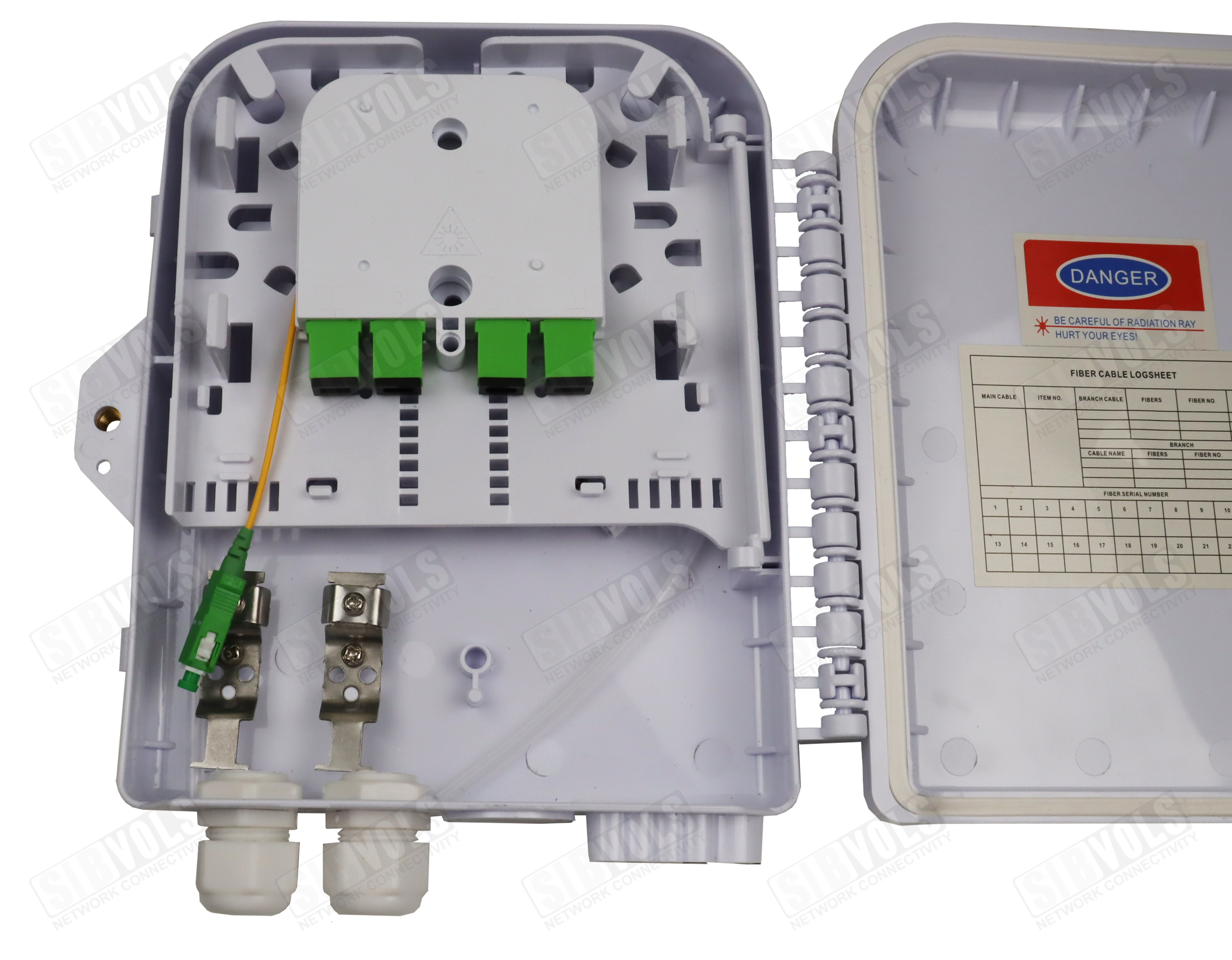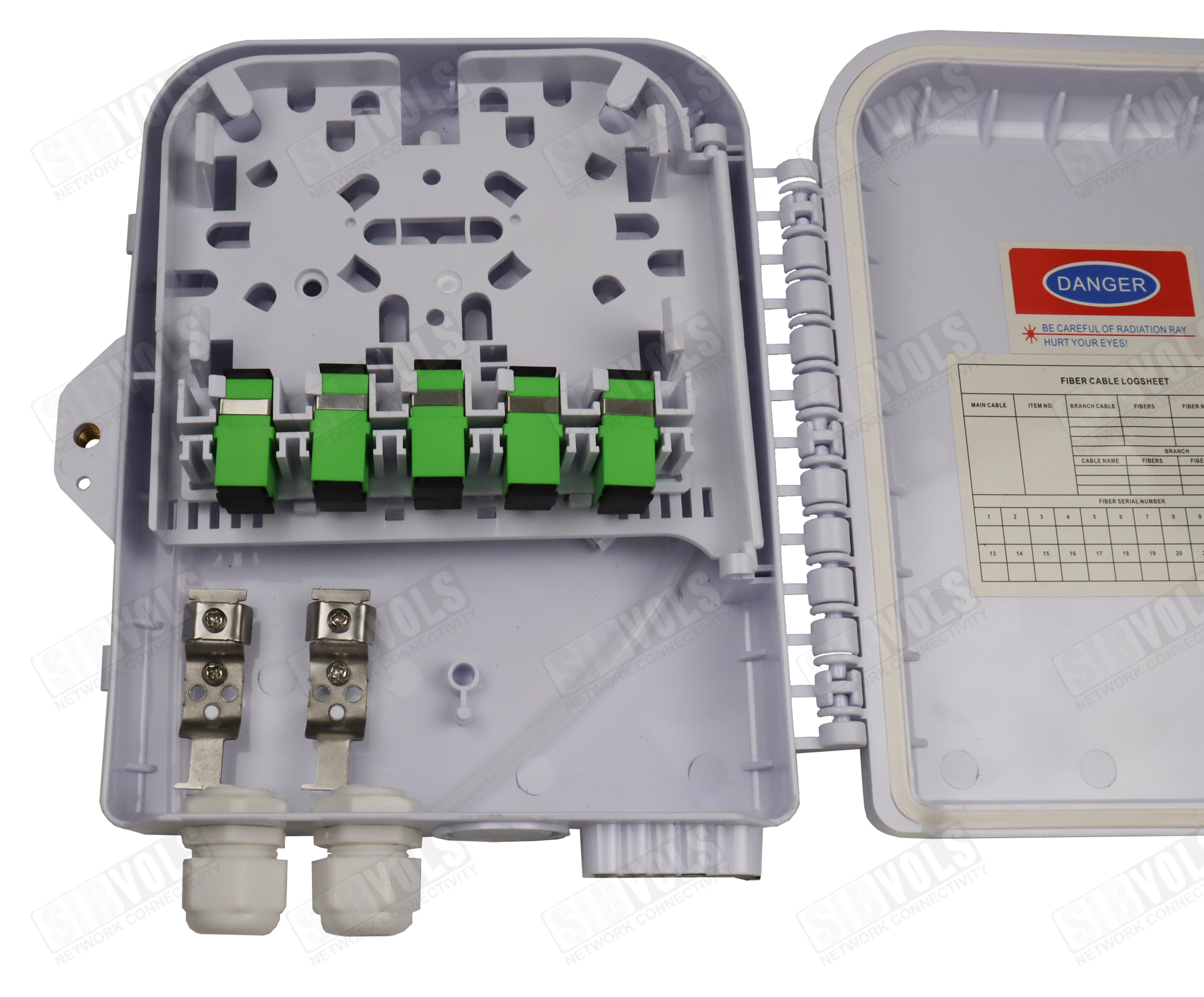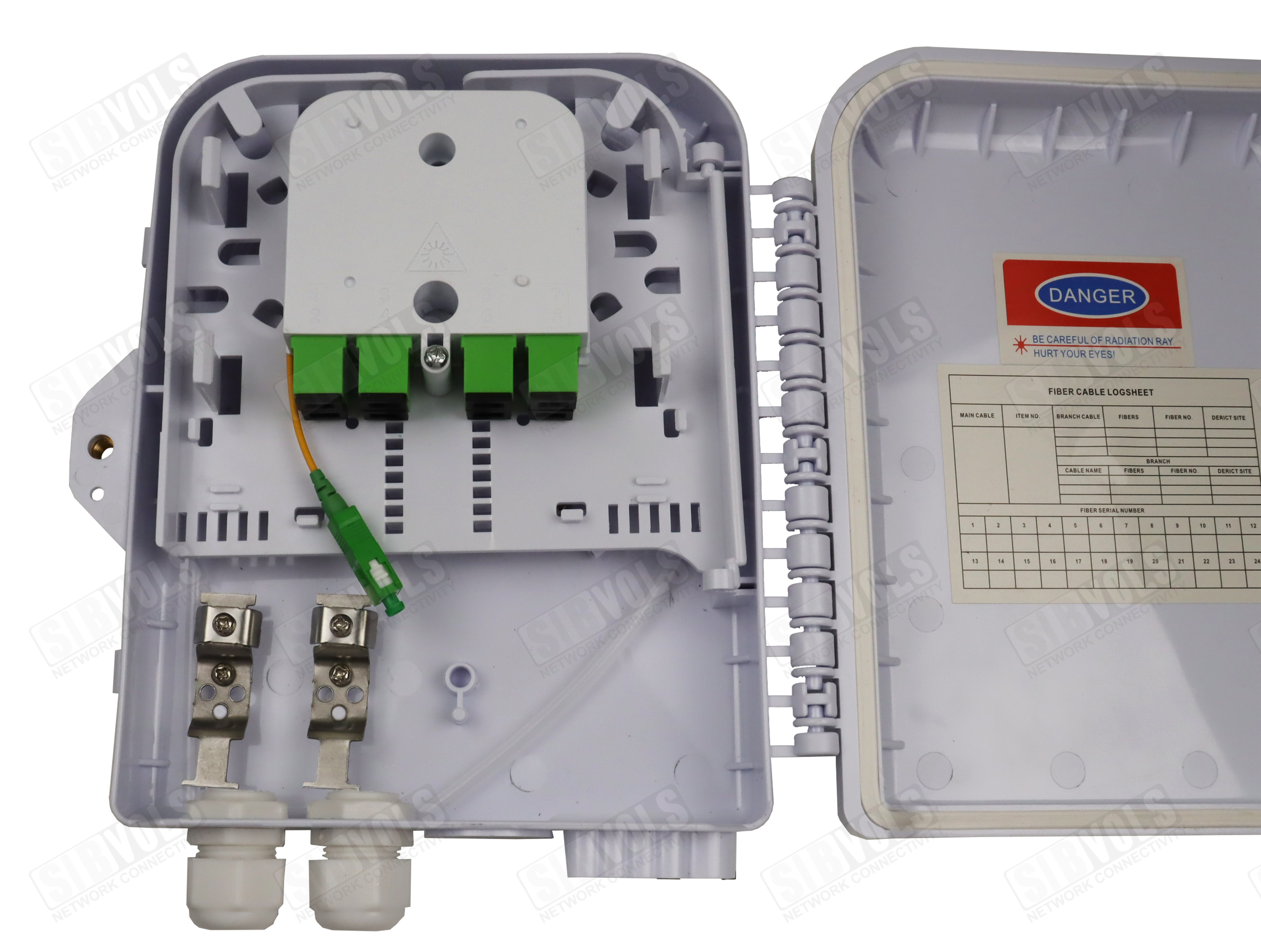 Внутри муфты расположена кассета с возможностью распределения до 12 SC адаптеров, а также есть возможность установки PLC сплиттера как кассетного типа, так и с микрокорпусом до 12 SC адаптеров.