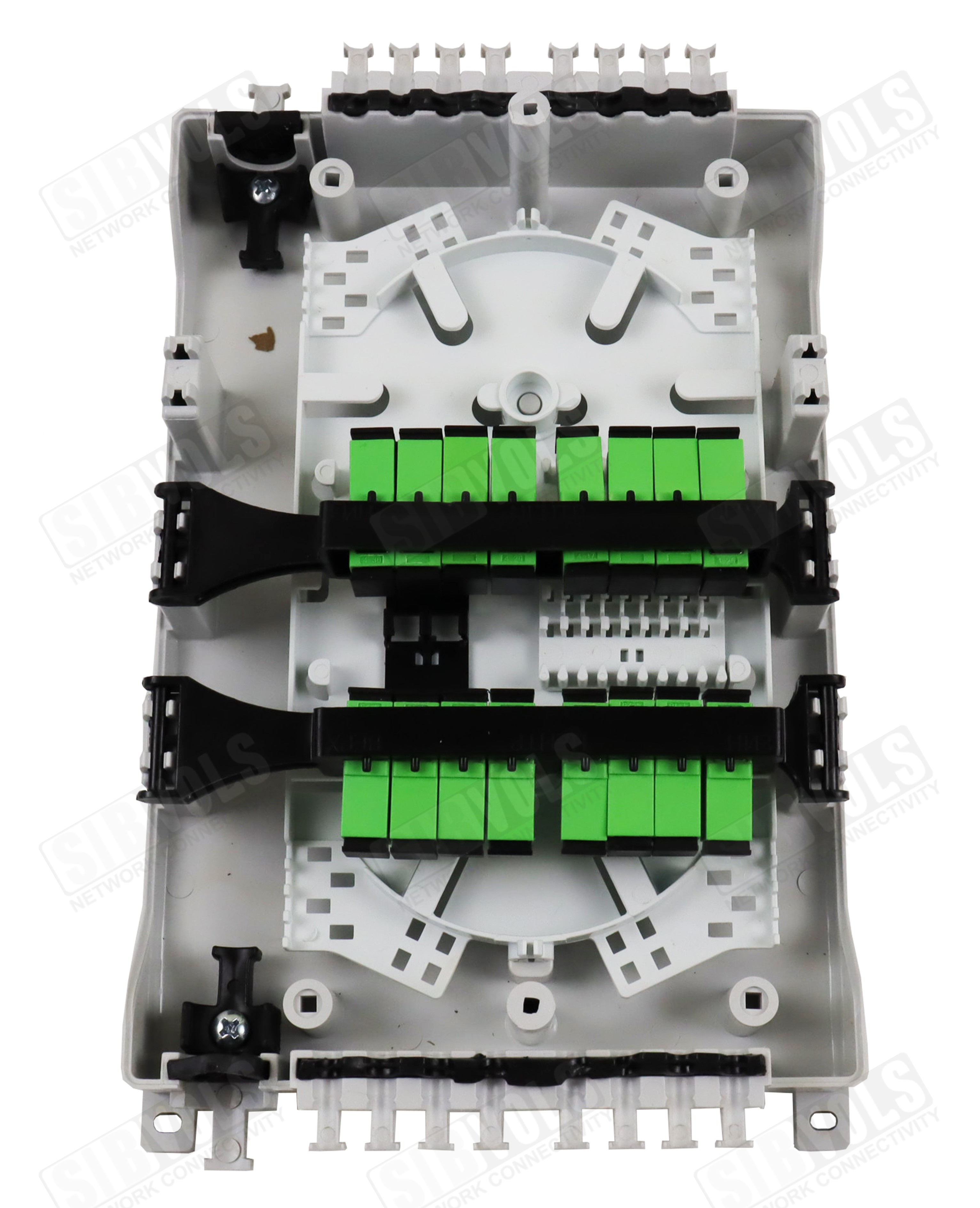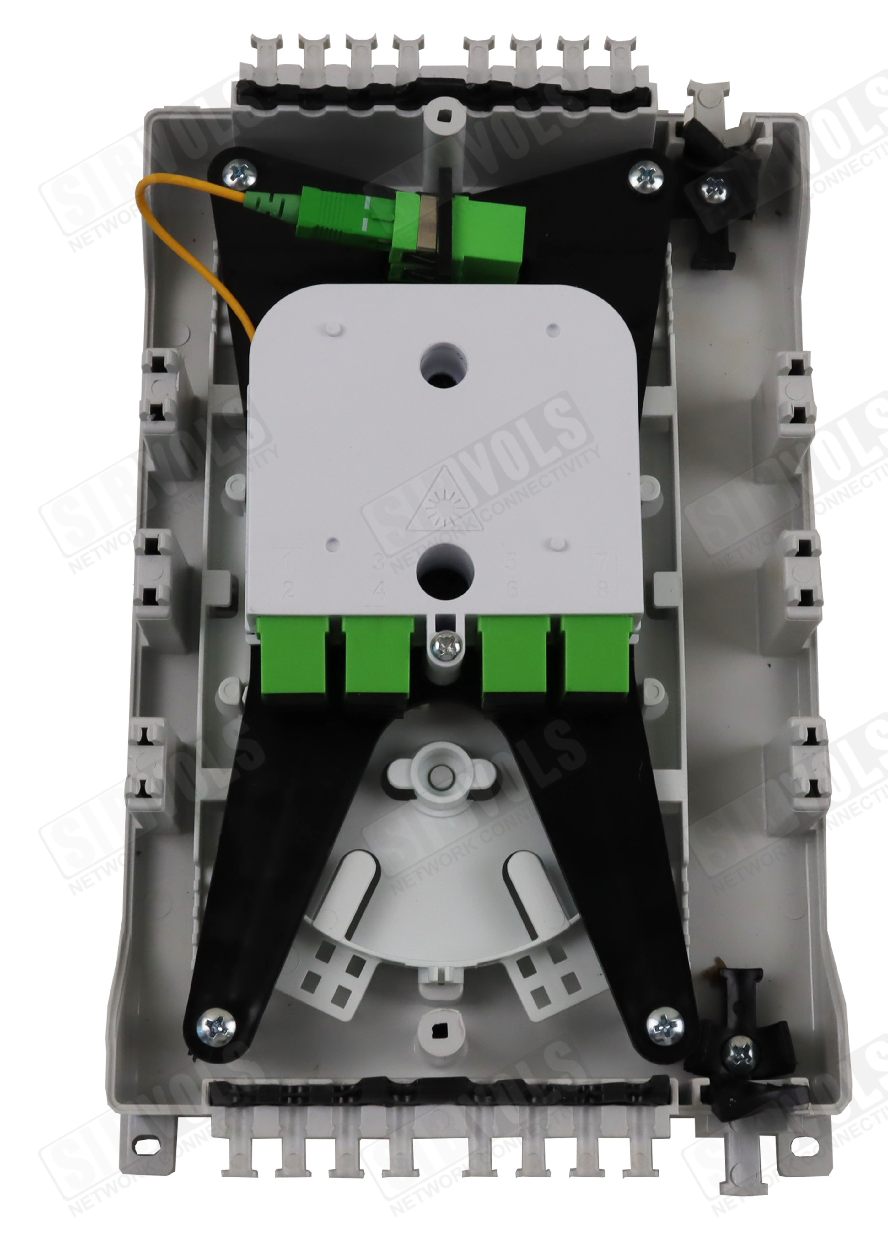 одной или двумя съемными поворотными планками для установки до 8 оптических адаптеров SC каждая (в зависимости от примененной схемой подключения абонентов);