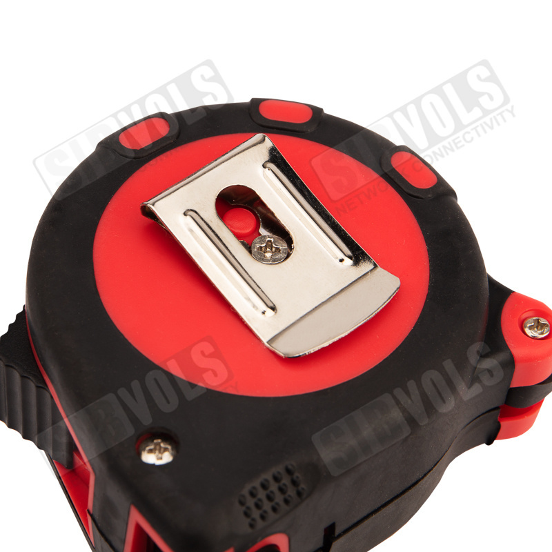 На корпусе расположена клипса-зажим для фиксации рулетки на ремне, кармане или поясной сумке. Ремешок позволяет надевать инструмент на запястье, чтобы освободить руки для работы.