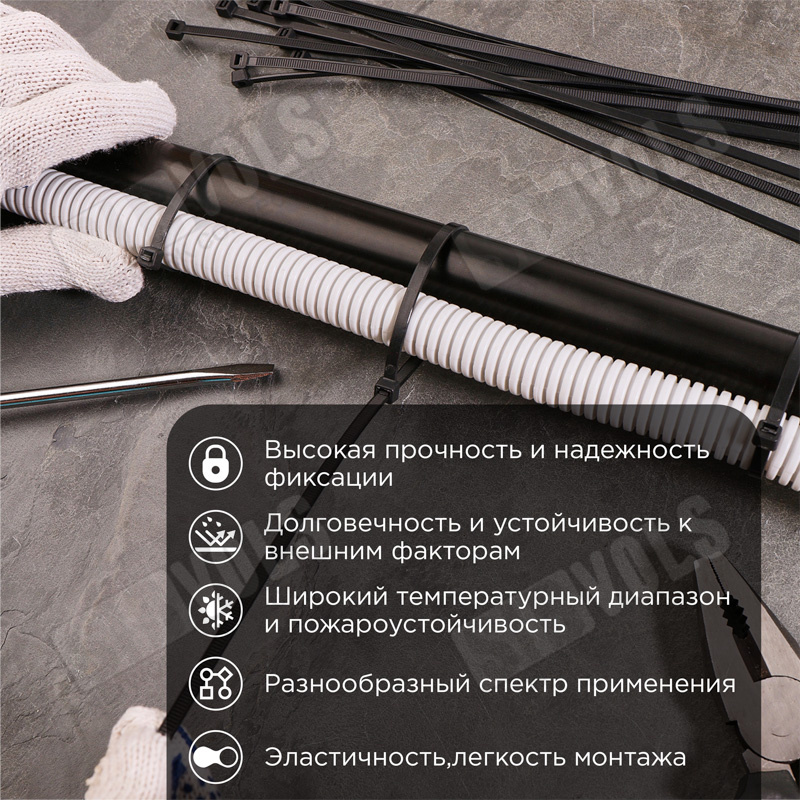 Нейлоновая стяжка REXANT отличается надежной фиксацией, прочностью и устойчивостью к внешним воздействиям. Изделие является экологически чистым продуктом, не содержит галогенов.