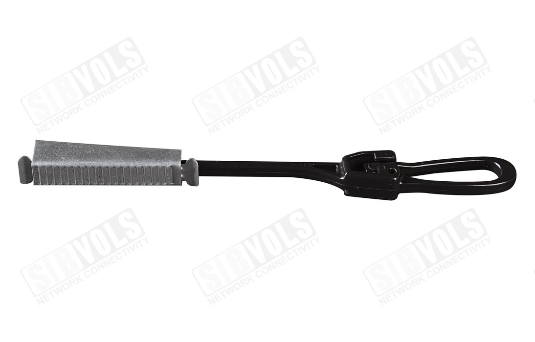 Конструкция зажима состоит из продольного ребристого корпуса, перфорированной вставки для лучшего сцепления с наружной оболочкой кабелей и клинообразным стержнем с прикрепленной петлей для монтажа к кронштейнам и узлам.